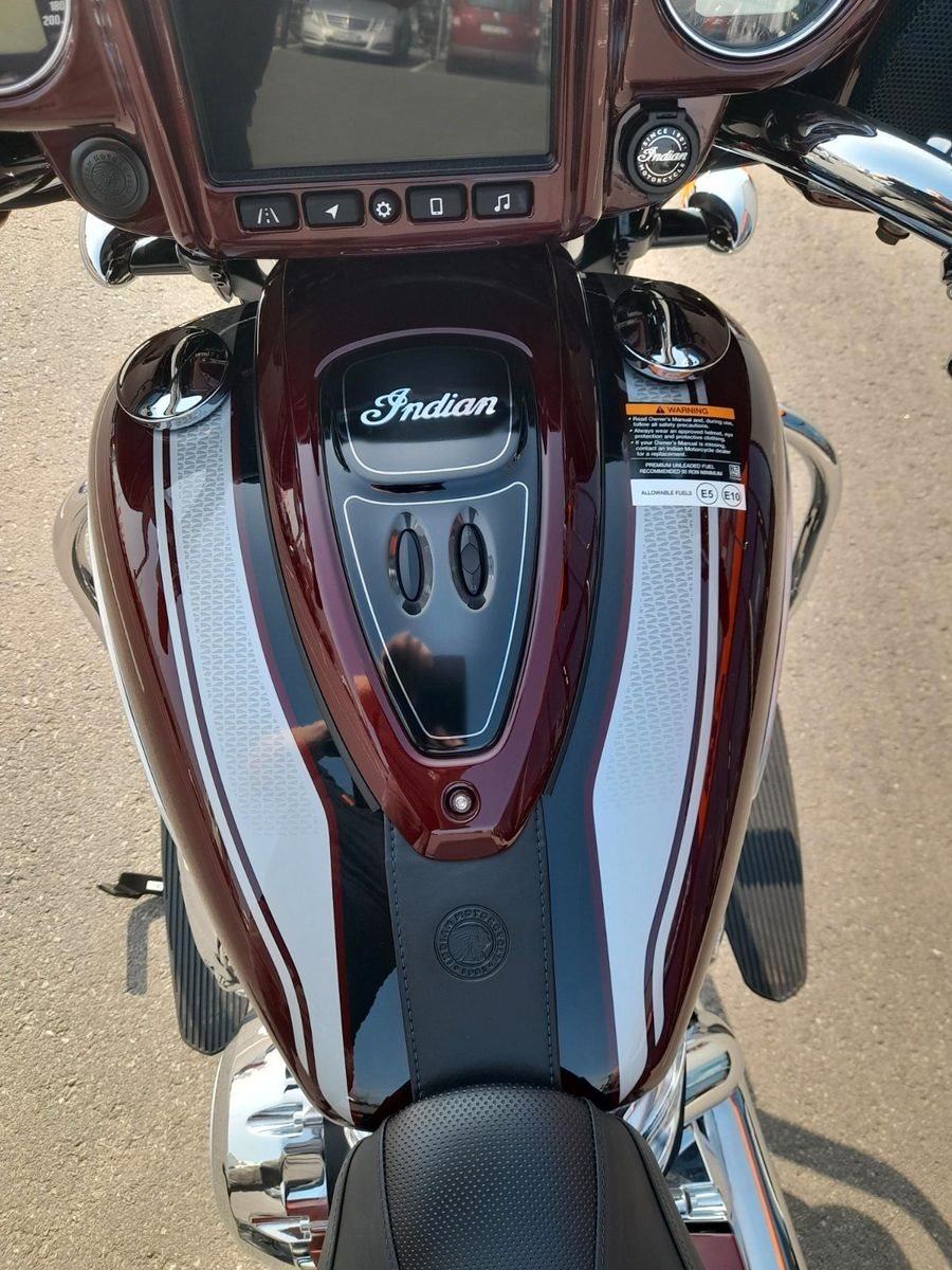 ERSTKLASSIGE AUSSTATTUNG Die Chieftain Limited ist serienmäßig mit LED-Beleuchtung, schlüsselloser Zündung, Tempomat, elektrisch verschließbaren Seitenkoffern, ABS und Reifendruckkontrolle ausgestattet. 7-Zoll-Touchscreen mit RIDE COMMAND inkl. Apple CarPlay-Integration; elektrische Windschutzscheibe; Highway Bars; Vinyl-Rogue-Sitz; Reifendrucküberwachung; fernbedienbare Hard Saddlebags; wählbare Fahrmodi; Deaktivierung des hinteren Zylinders; ABS; Tempomat; schlüssellose Zündung; 100-Watt-Audiosystem mit AM/FM, Bluetooth, USB, Smartphone-kompatiblem Eingang; 12-V-Ladeanschluss