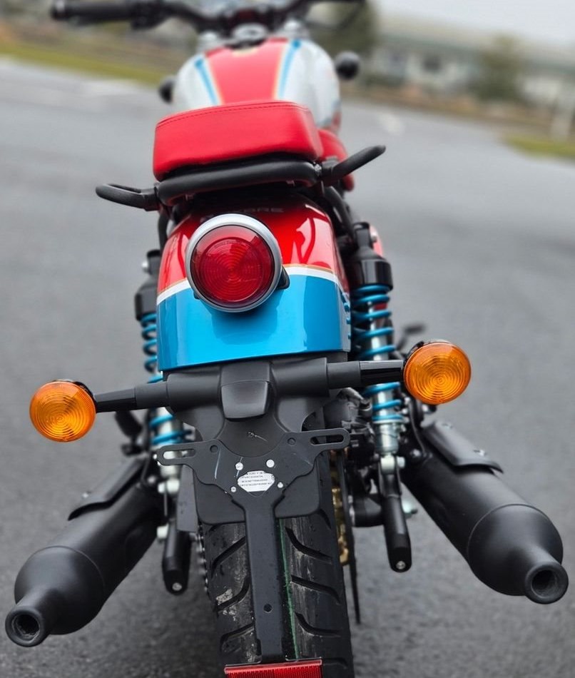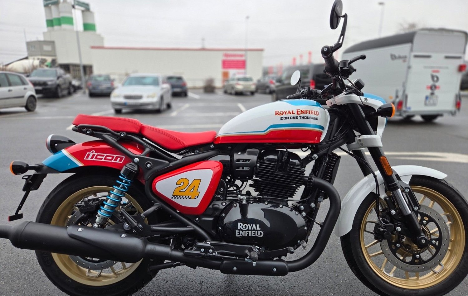 Die Royal Enfield Shotgun 650 Icon Edition, inspiriert vom "Always Something"-Custom-Bike von ICON Motosports, ist ein streng limitiertes Sondermodell (nur 100 Stück weltweit). Sie zeichnet sich durch eine 3-Ton-Lackierung, goldene Felgen, blaue Federn und einen roten Sitz aus. Die technische Basis bleibt der 648ccm-Zweizylinder. Für eine Besichtigung oder Probefahrt kontaktieren Sie uns gerne.