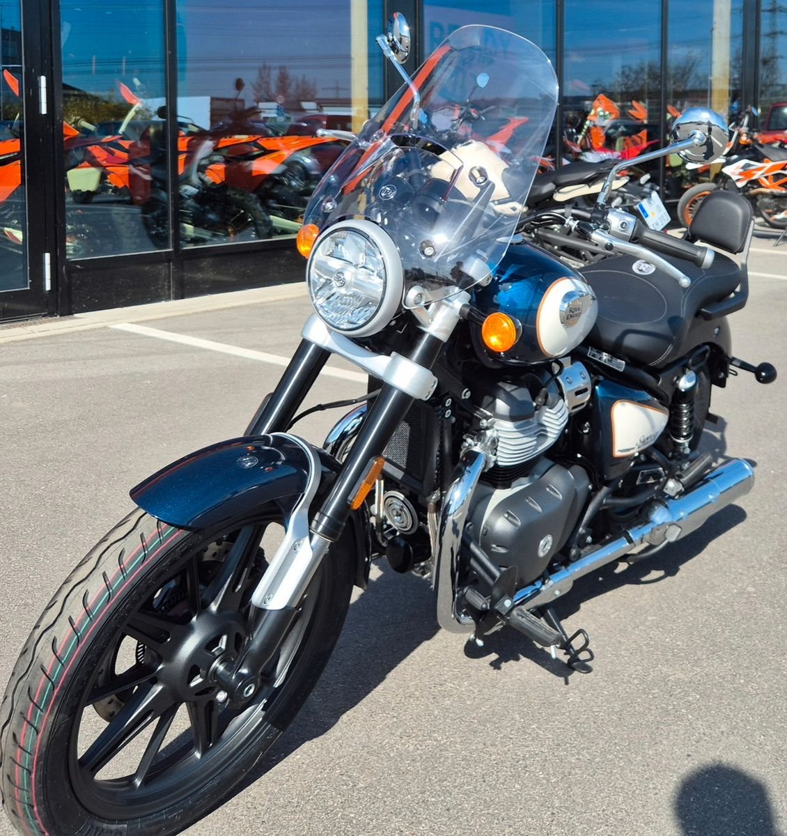 Sissybar, Tourenscheibe, Touringsitzbank Das Herzstück der Super Meteor 650 ist unser ikonischer Parallel-Twin-Motor, der nahtlose Gangwechsel, eine starke Beschleunigung im unteren Drehzahlbereich und eine ruckfreie, gleichmäßige Gasannahme gewährleistet. Für eine Besichtigung oder Probefahrt kontaktieren Sie uns gerne.