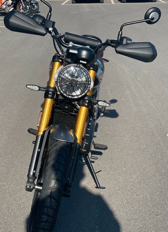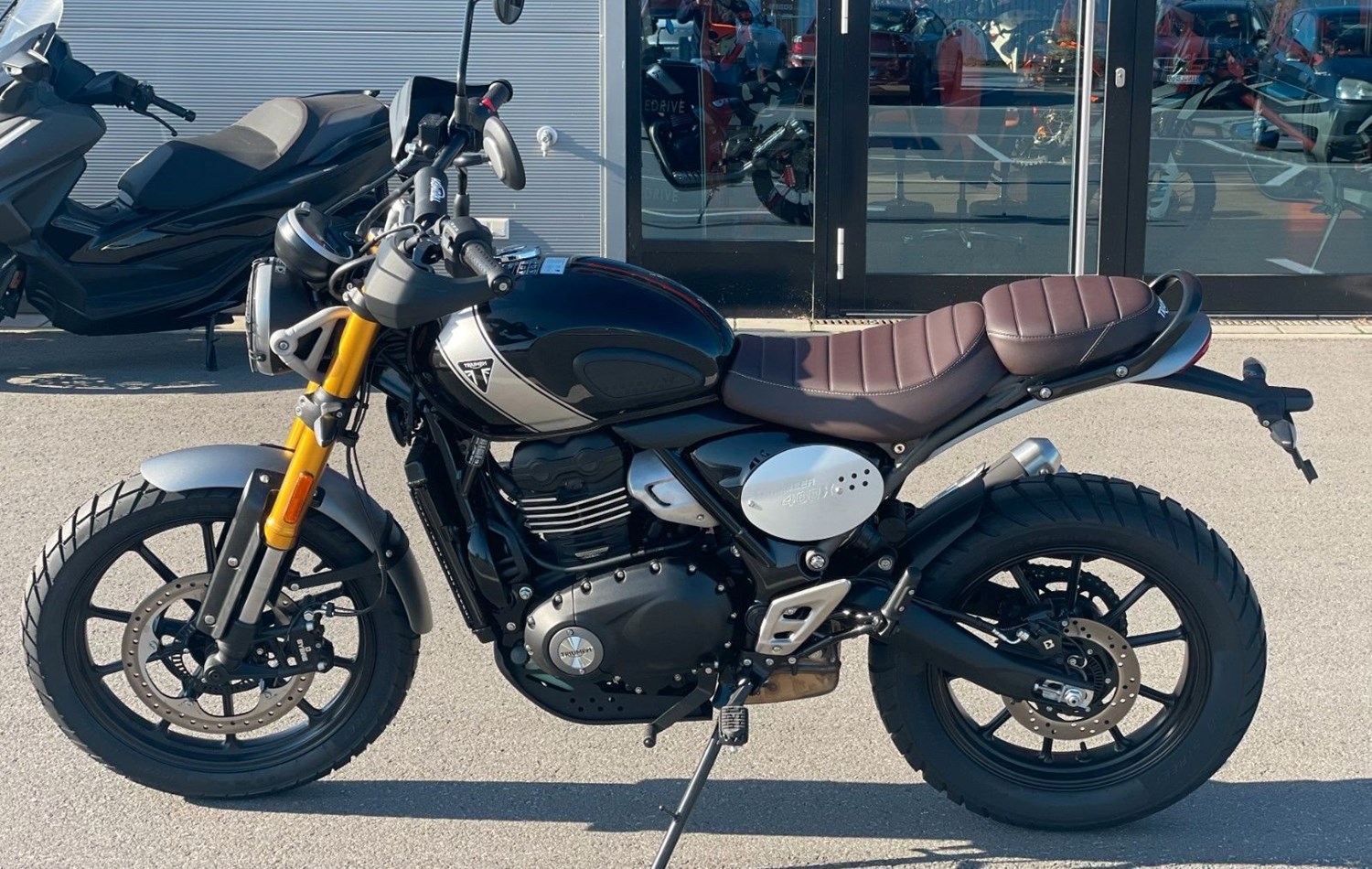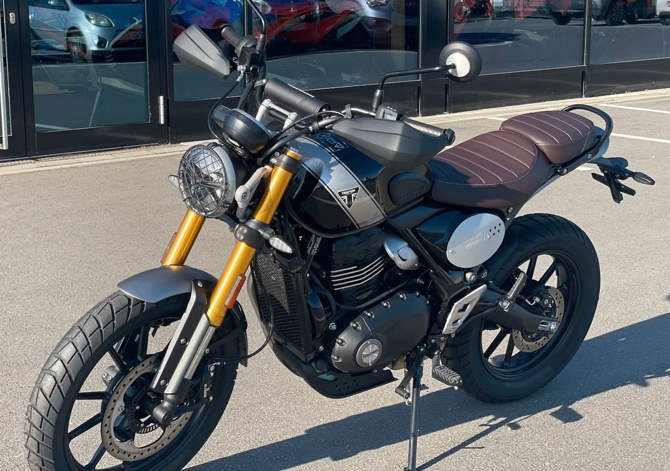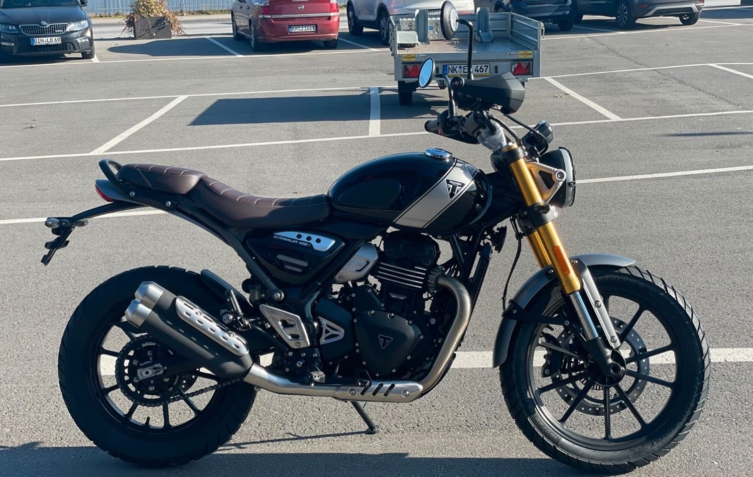 Die Scrambler 400 X ist ein erfrischender Neuzugang in der Scrambler-Familie von Triumph und eröffnet einer ganz neuen Generation das Fahrerlebnis der modernen Klassiker von Triumph.Mit ihrer zeitlosen Scrambler-Silhouette und der unverwechselbaren, gerippten Sitzbank bietet die Scrambler 400 X den unverkennbaren Stil einer Triumph, kombiniert mit hochwertiger Verarbeitung und erstklassiger Ausstattung voller moderner Fahrtechnologie.Der in Hinckley konstruierte Einzylindermotor erzeugt den für Triumph typischen charaktervollen und reaktionsschnellen Antrieb mit klassenbester Leistung und Drehmoment.Die souveräne Sitzposition mit breitem Lenker sorgt in Verbindung mit dem Scrambler-spezifischen Fahrwerk für Komfort auf der Straße und im Gelände.Die hochwertige Aufhängung mit 150 mm Federweg und der Doppelkolben-Bremssattel gewährleisten ein präzises, agiles und intuitives Handling und helfen sowohl neuen als auch erfahrenen Fahrern, das volle Potenzial der Scrambler 400 X voll auszuschöpfen.